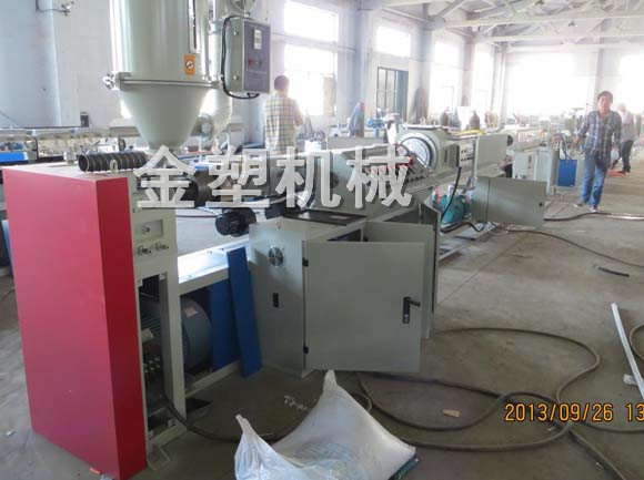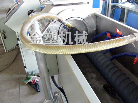 該機(jī)是在預(yù)應(yīng)力塑料波紋管(竹節(jié)型)設(shè)備基礎(chǔ)上開發(fā)新型替代設(shè)備產(chǎn)品外形呈螺旋波紋形狀。該機(jī)具有設(shè)備造價(jià)低,結(jié)構(gòu)緊湊,工藝簡(jiǎn)單,操作方便,一機(jī)兩用(圓扁管都可生產(chǎn))等特點(diǎn)。全套設(shè)備由SJ系列單螺桿擠出→擠出模具→螺旋成型模具→真空噴淋水箱→牽引機(jī)→鋸割機(jī)→反轉(zhuǎn)平臺(tái)組成 。